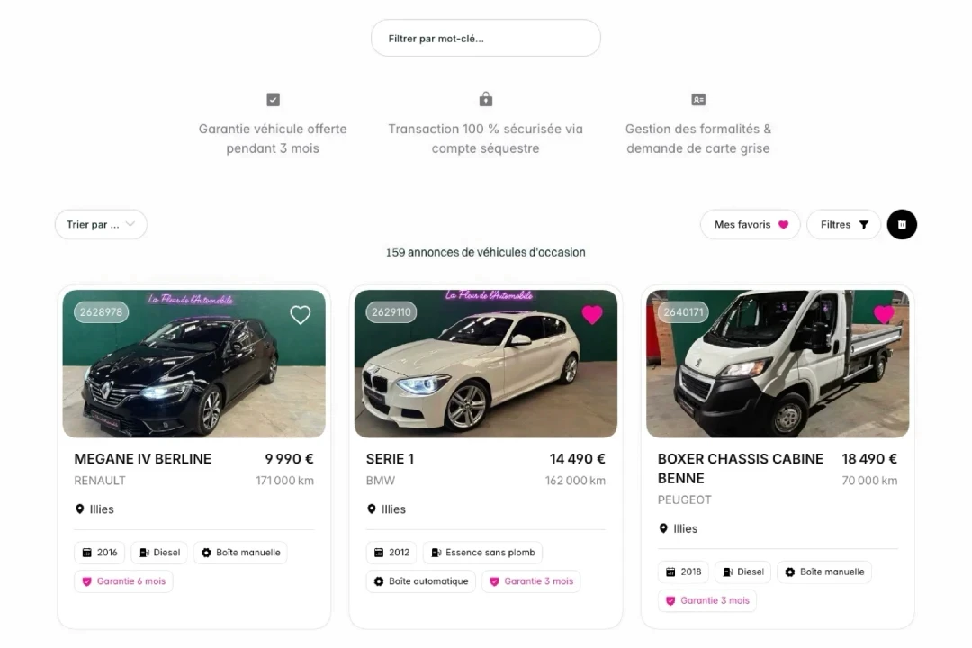 L'objectif était double : moderniser radicalement l'image de marque de La Fleur de l'Automobile et offrir un outil de listing, recherche et filtrage de véhicules ultra-performant pour soutenir la croissance commerciale du parc.